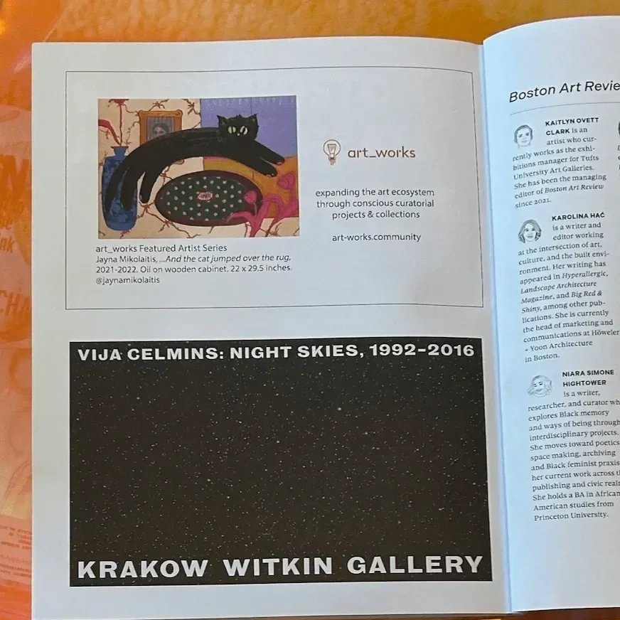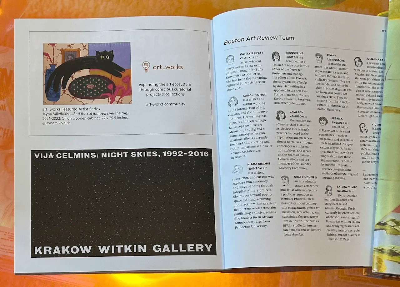 By reframing our advertising space in Boston Art Review, we created a "Featured Artist Series" to highlight emerging artists generating excitement in the Boston art scene. Each feature transforms traditional advertising space into a platform for storytelling—pairing striking imagery with thoughtful writing to celebrate emerging voices and experimental practices.