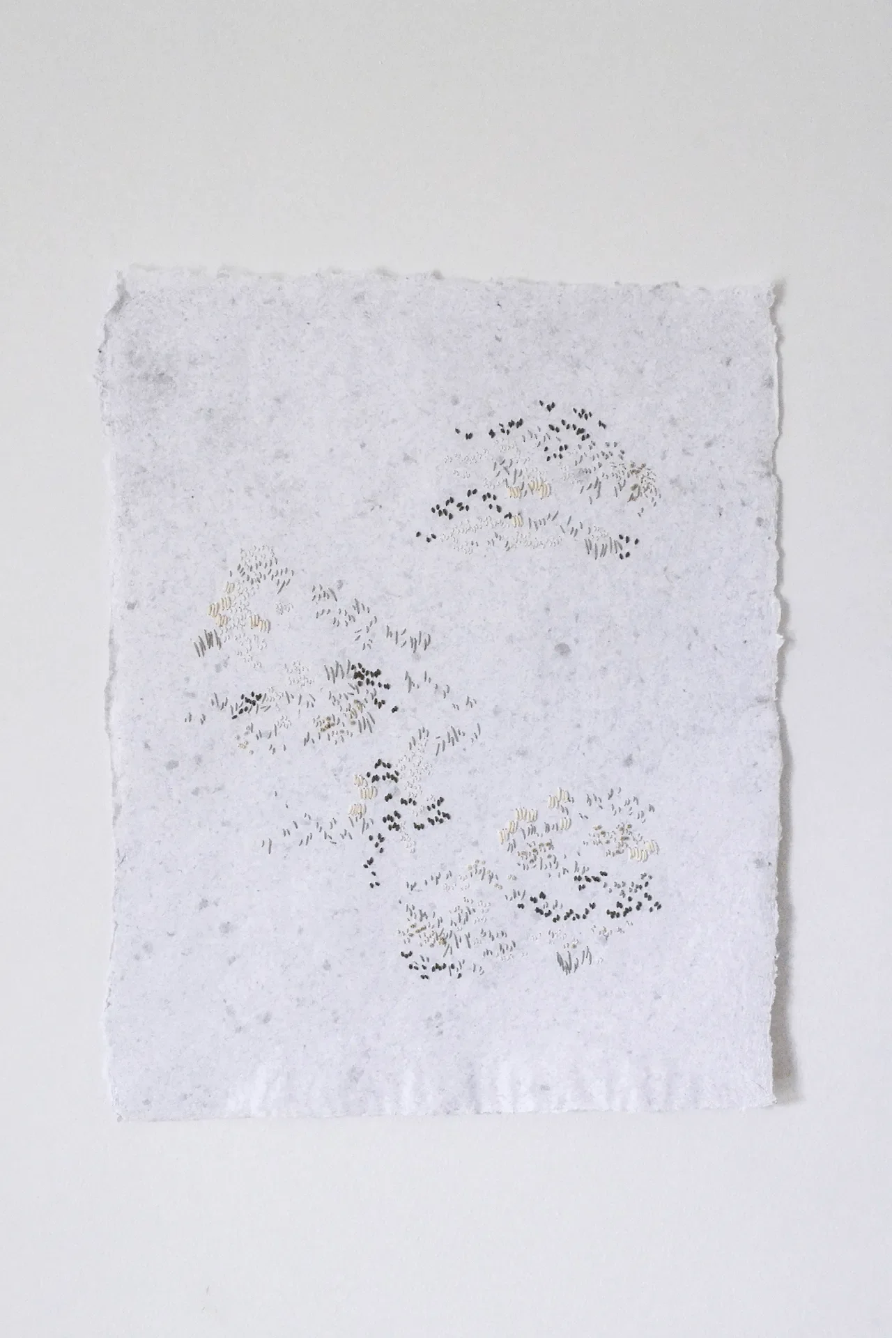 About the exhibition: Exuding a hushed sense of purposeful stillness, Montreal-based artist Véronique Buist's dimensional work is as varied as it is cohesive. In her delicate amalgamations of homemade paper and embroidery, she captures the splintering ice of northern territories, the vast slopes of Canadian wilderness, eccentrically structured garden crops, and snow-dappled concrete walls. The sheets of paper on which she embroiders are fashioned from shredded cotton thread and fabric cutouts, allowing her to match the exact tonality of her embroidery designs and create seamless continuity of material.